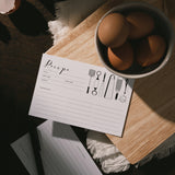 These recipe cards feature original illustrations hand drawn by me, Susan Hazel Rich. The design is printed on bright-white, ultra-thick matte cardstock paper, which was selected for its quality and durability, and offers an absorbent writing surface. The paper is manufactured in the USA with post-consumer fiber, practices that reduce pollution, and energy saving production methods.